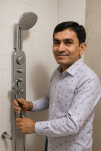 “Premium bathroom setup, body shower, wall-mounted fittings — expert installation with finishing.”